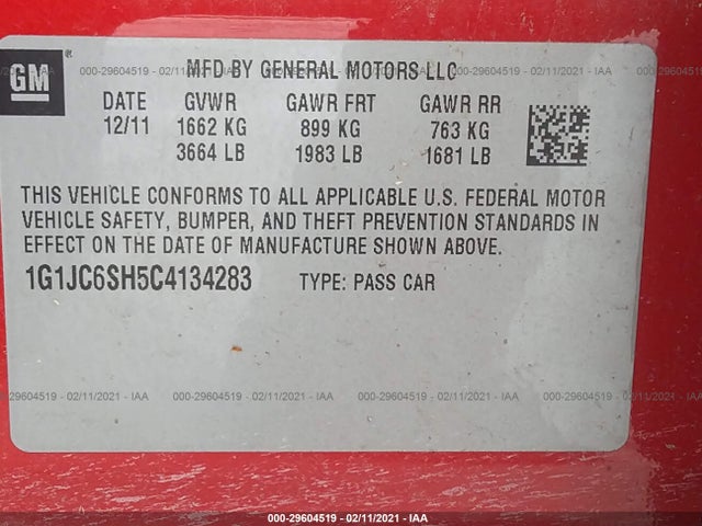 CHEVROLET SONIC 2012 LT (AUTOMATIC) ECOTEC 1.8L Variable Valve VIN: 1G1JC6SH5C4134283