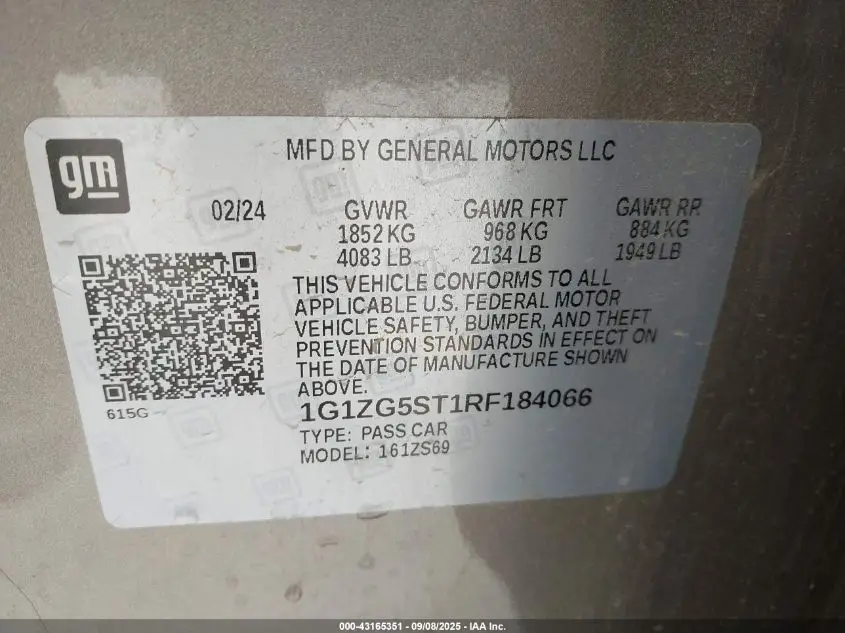 CHEVROLET MALIBU 2024 RS 1.5L I4 N VIN: 1G1ZG5ST1RF184066