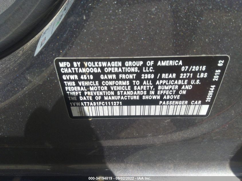 VOLKSWAGEN PASSAT 2015 1.8T LIMITED EDITION Unknown 1.8L I4 FI DOHC 16V NF4 VIN: 1VWAT7A31FC111271