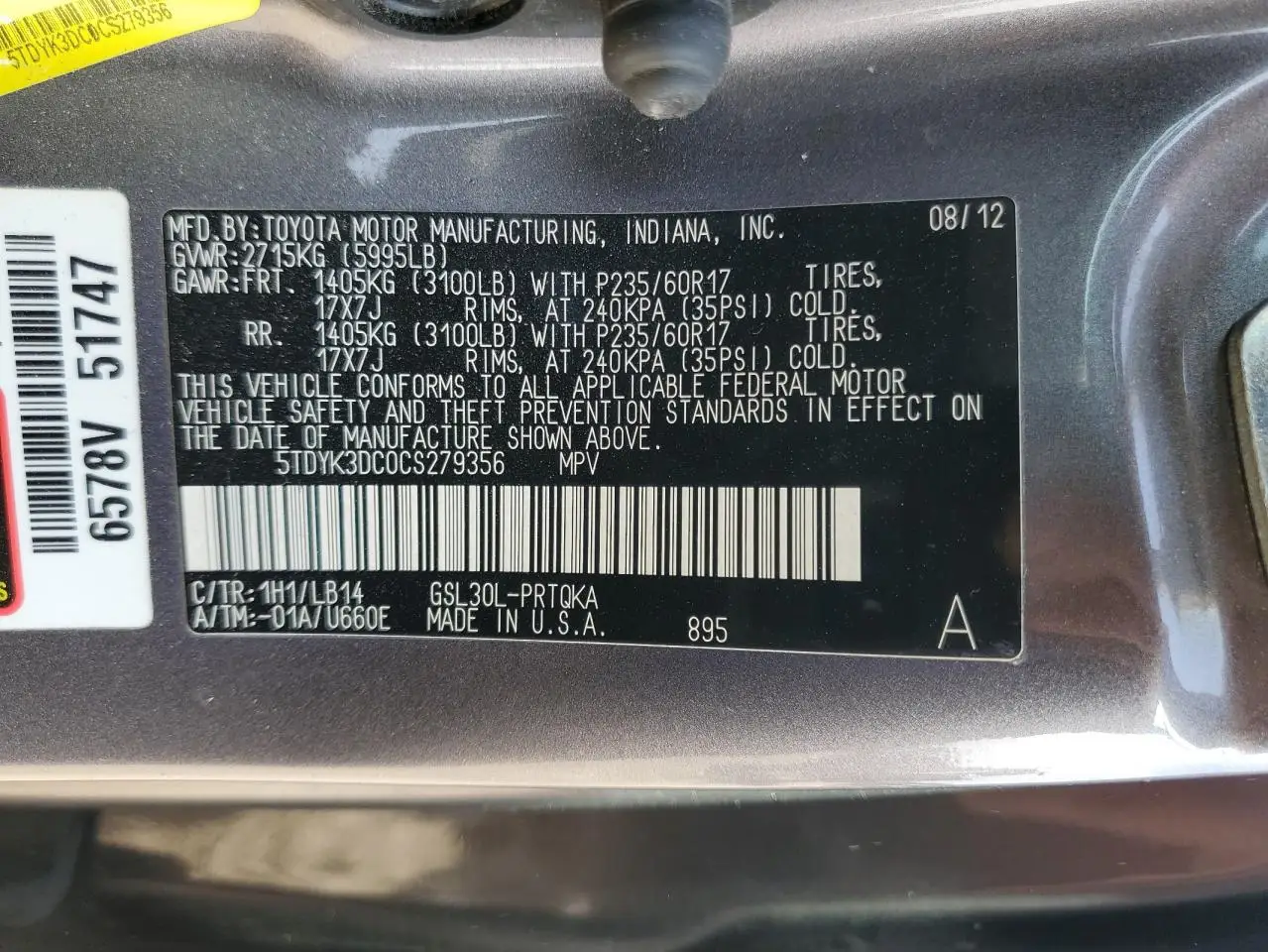 TOYOTA All Models 2012 SIENNA XLE GRAY 3.5L 6 VIN: 5TDYK3DC0CS279356