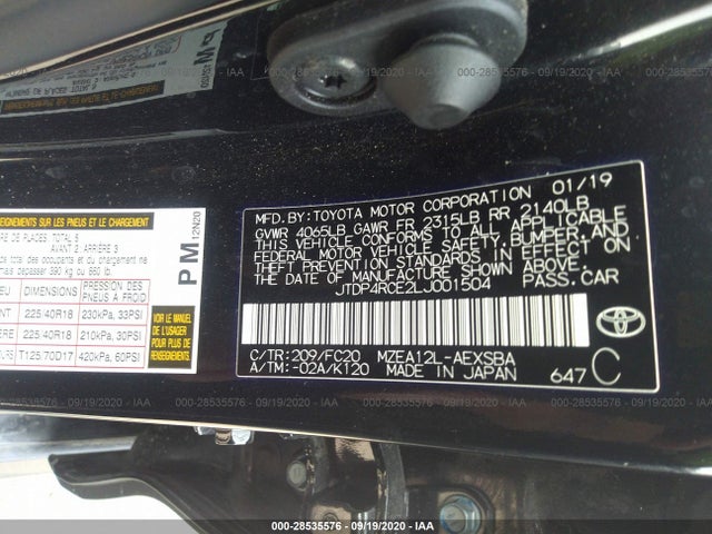 TOYOTA COROLLA 2020 SE, CVT, W/PREMIUM PKG 2.0L I-4 DOHC 16-Valve -inc VIN: JTDP4RCE2LJ001504