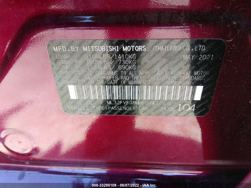 MITSUBISHI MIRAGE G4 2021 SE Purple 1.2L MIVEC DOHC 3-CYLINDER VIN: ML32FVFJ8MHF07472