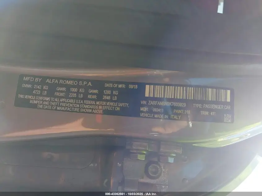 ALFA ROMEO GIULIA 2019 TI AWD 2.0L I-4 DI, VVT, turbo, 280HP VIN: ZARFANBN9K7603929
