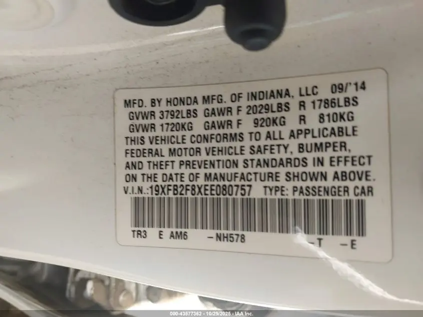 HONDA CIVIC 2014 EX White 1.8L I-4 VVT, 143HP VIN: 19XFB2F8XEE080757