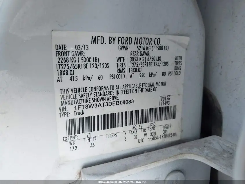 FORD F350 2013 SUPER DUTY VIN: 1FT8W3AT3DEB08083