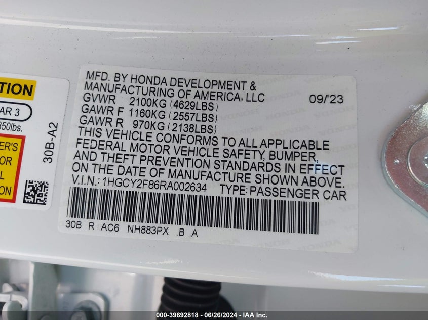 HONDA ACCORD 2024 HYBRID TOURING White 2.0L I-4 DI, DOHC, VVT, 146HP VIN: 1HGCY2F86RA002634
