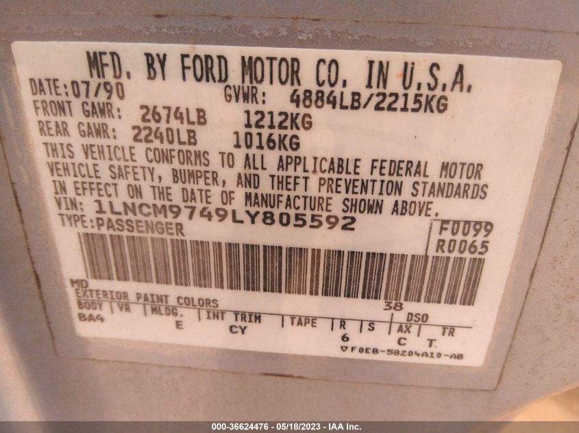LINCOLN CONTINENTAL 1990 EXECUTIVE Light Blue 3.8L V6 FI F VIN: 1LNCM9749LY805592