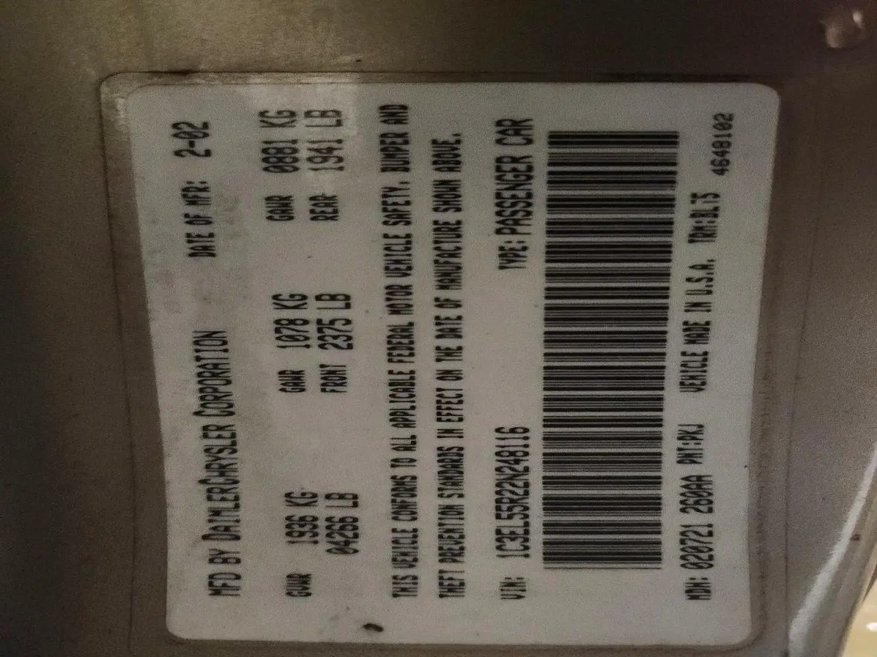 CHRYSLER SEBRING 2002 LXI GOLD 2.7L 6 VIN: 1C3EL55R22N248116