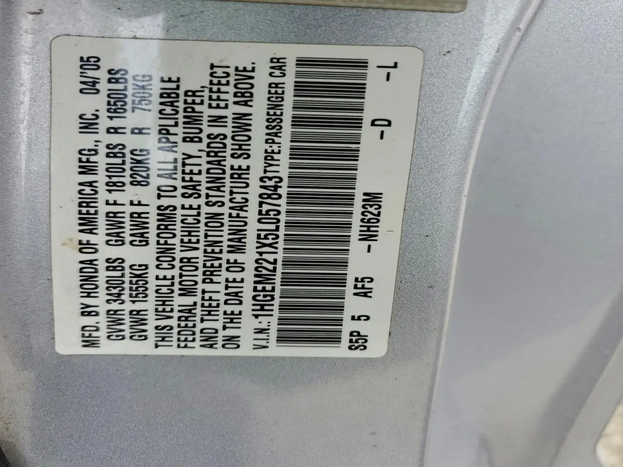 HONDA CIVIC 2005 DX V GRAY 1.7L 4 VIN: 1HGEM221X5L057843