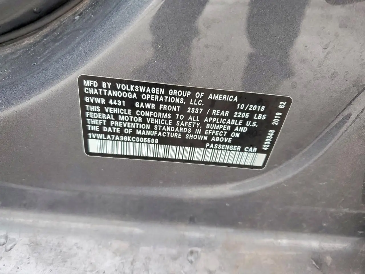 VOLKSWAGEN PASSAT 2019 WOLFSBURG GRAY 2.0L 4 VIN: 1VWLA7A36KC005598