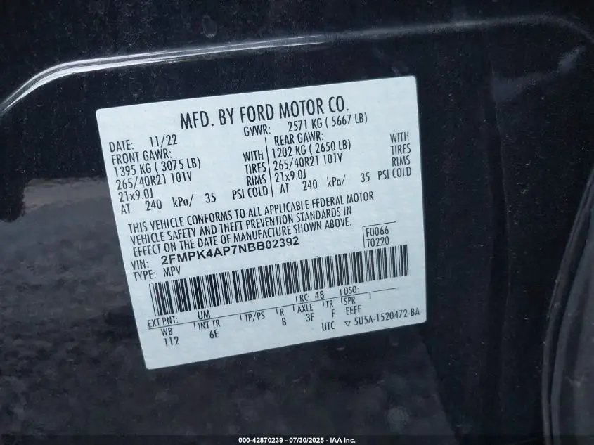 FORD EDGE 2022 ST Black 2.7L V-6 DI, DOHC, VVT, turbo, 335HP VIN: 2FMPK4AP7NBB02392