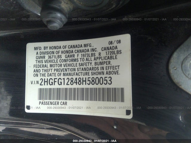 HONDA CIVIC CPE 2008 EX 1.8L SOHC MPFI 16-valve VIN: 2HGFG12848H580053