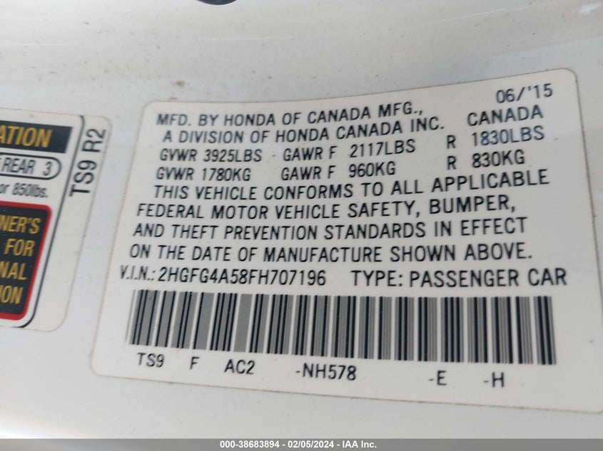 HONDA CIVIC 2015 SI White 2.4L I-4 DOHC, VVT, 205HP VIN: 2HGFG4A58FH707196