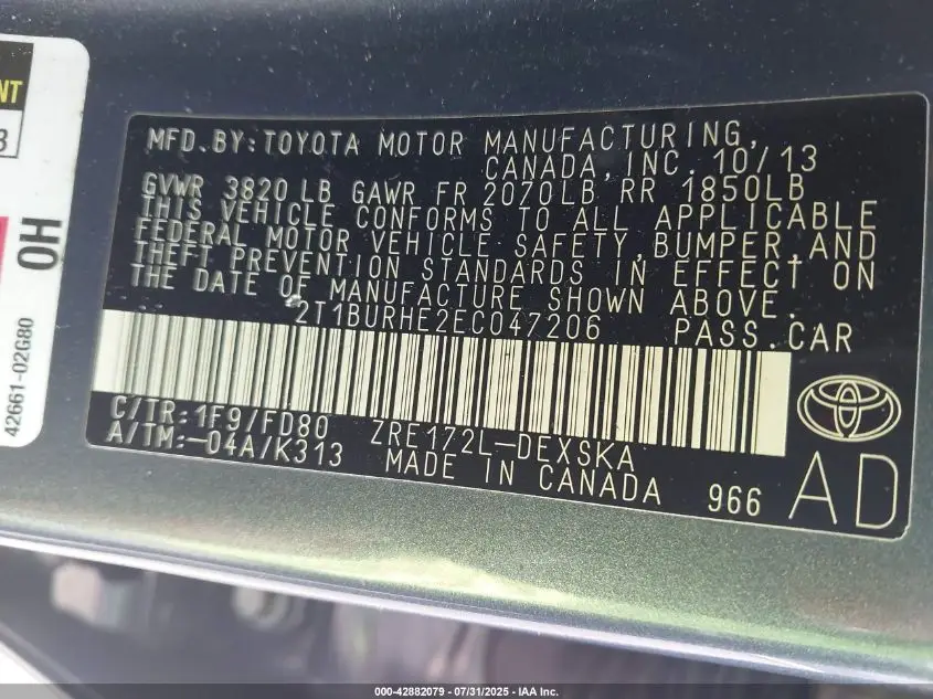 TOYOTA COROLLA 2014 S PLUS 1.8L I-4 DOHC, VVT, 132HP VIN: 2T1BURHE2EC047206