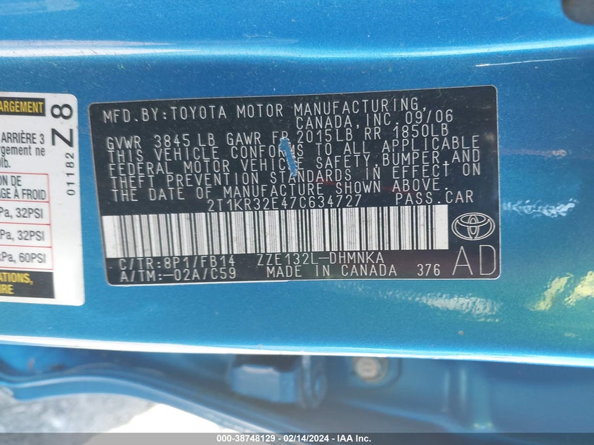 TOYOTA COROLLA MATRIX 2007 XR Blue 1.8L I4 FI DOHC 16V F4 VIN: 2T1KR32E47C634727