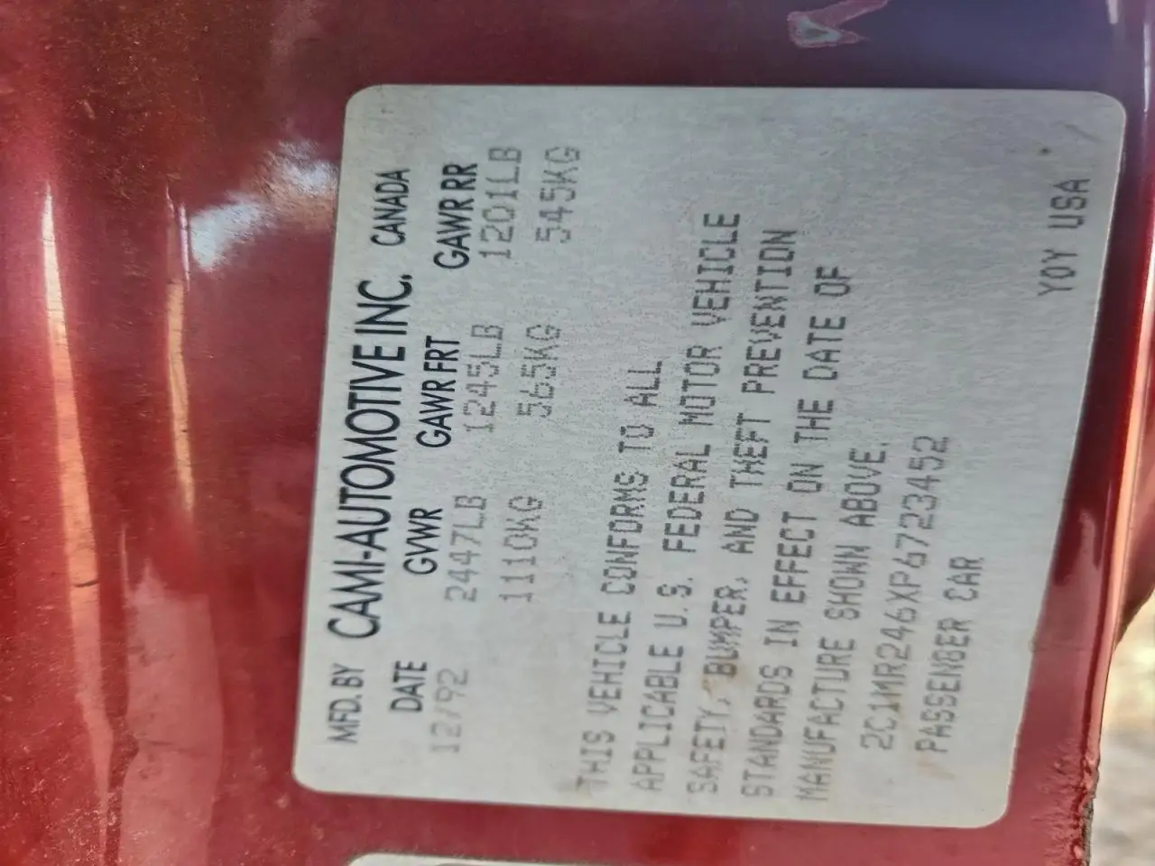 GEO METRO 1993 BASE/LSI TWO TONE 1.0L 3 VIN: 2C1MR246XP6723452