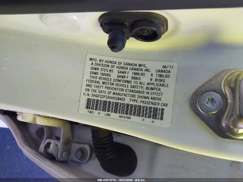 HONDA CIVIC 2017 LX White 2.0L I-4 DOHC, VVT, 158HP VIN: 2HGFC2F52HH538403