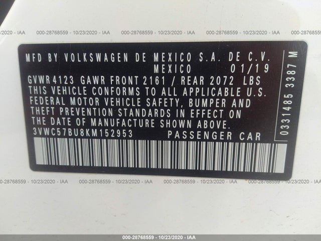 VOLKSWAGEN JETTA 2019 1.4 TSI (S/SE/R-LINE) 1.4L TSI I-4 Turbocharged VIN: 3VWC57BU8KM152953
