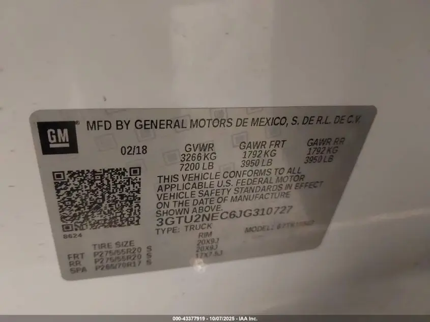 GMC SIERRA 1500 2018 SLT 5.3L V-8 DI, VVT, 355HP VIN: 3GTU2NEC6JG310727