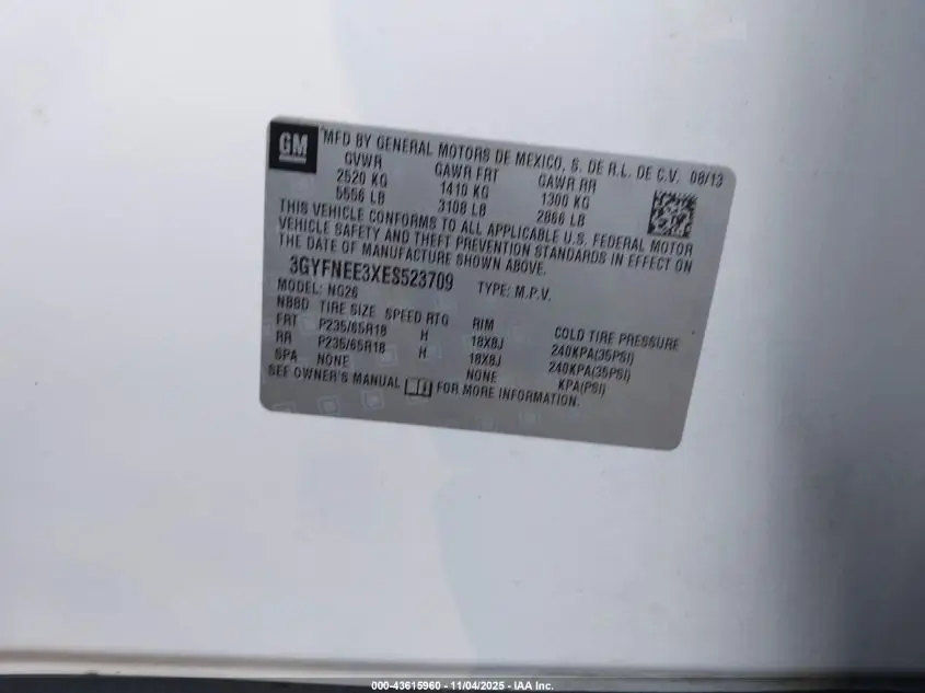 CADILLAC SRX 2014 LUXURY COLLECTION 3.6L V-6 DI, DOHC, VVT, 308HP VIN: 3GYFNEE3XES523709