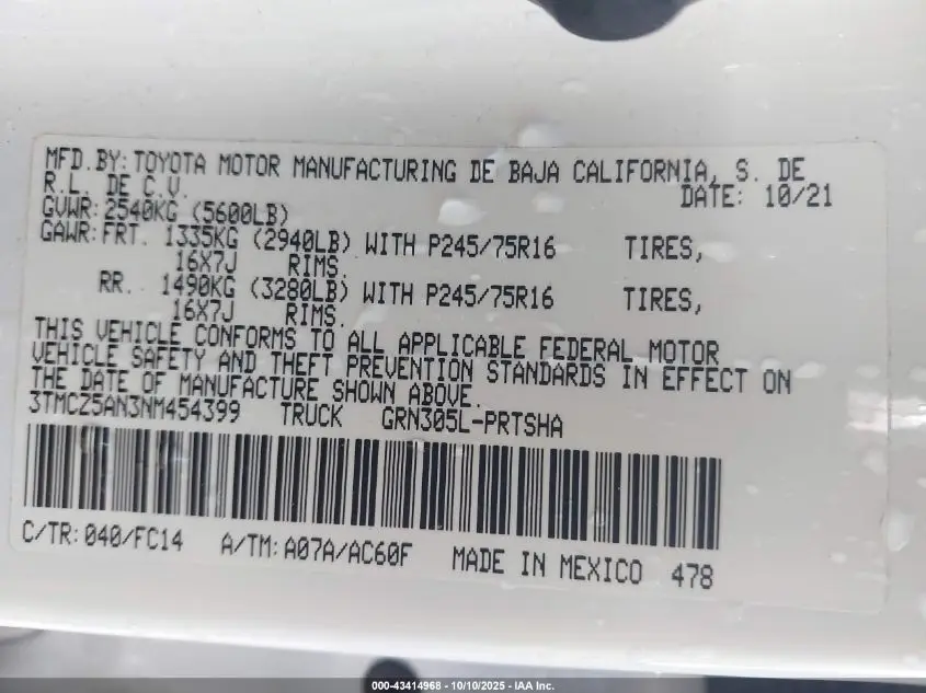 TOYOTA TACOMA 2022 SR5 V6 3.5L V-6 DI, DOHC, VVT, 278HP VIN: 3TMCZ5AN3NM454399