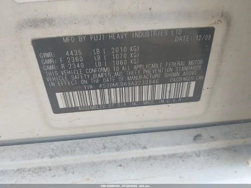 SUBARU LEGACY 2010 2.5I PREMIUM White 2.5L H-4 VVT, 170HP VIN: 4S3BMCB69A3230846