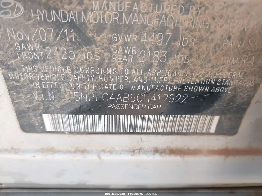 HYUNDAI SONATA 2012 SE 2.0T 2.0L I-4 DI, DOHC, VVT, turbo, 274HP VIN: 5NPEC4AB6CH412922