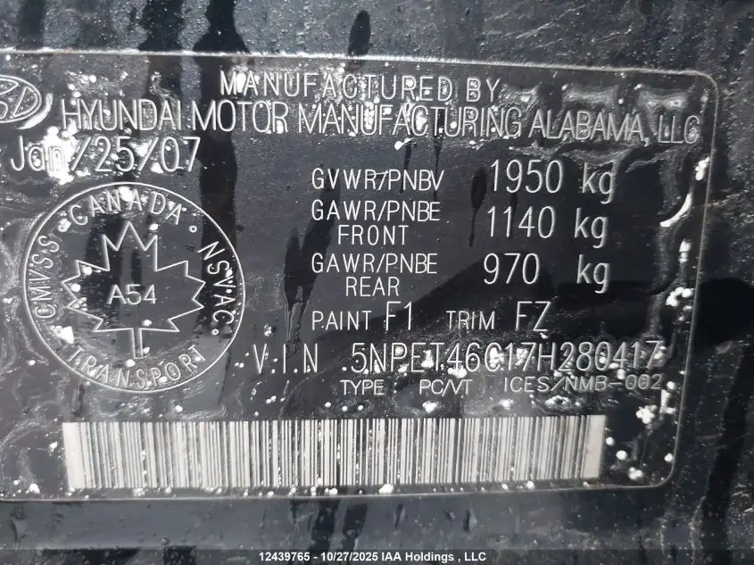 HYUNDAI SONATA 2007 GL/GLS Black VIN: 5NPET46C17H280417