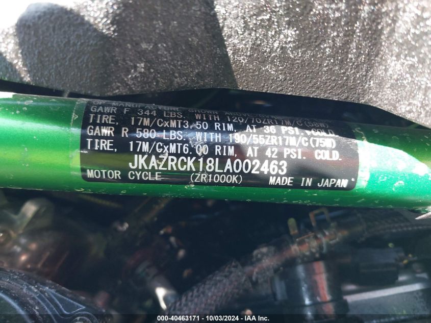 KAWASAKI ZR1000 2020 K 4 VIN: JKAZRCK18LA002463