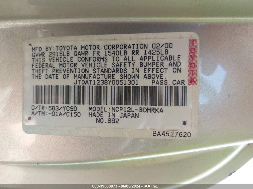 TOYOTA ECHO 2000 NCP12L Gold 1.5L I-4 DOHC, VVT, 108HP VIN: JTDAT1238Y0051301
