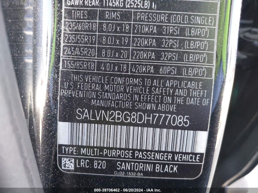 LAND ROVER RANGE ROVER EVOQUE 2013 PURE Black 2.0L I-4 DI, DOHC, VVT, turbo, 240HP VIN: SALVN2BG8DH777085
