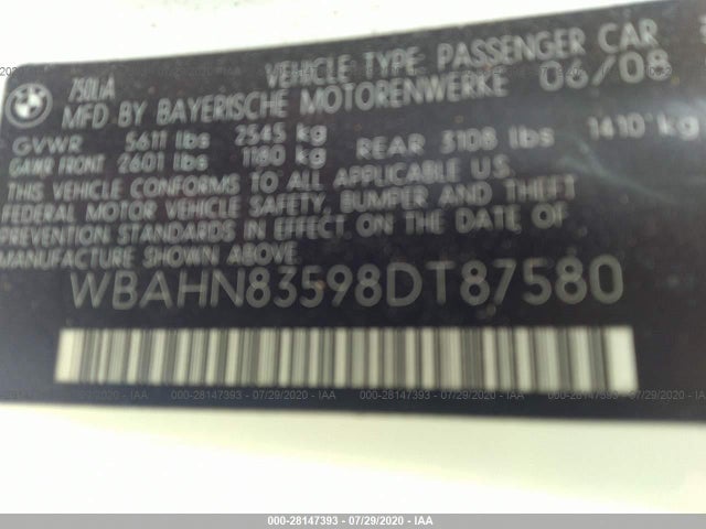 BMW 7 SERIES 2008 7-SERIES 4.8L DOHC 32-valve V8 VIN: WBAHN83598DT87580
