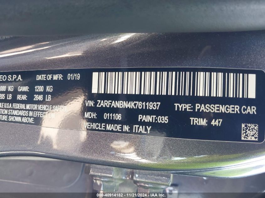 ALFA ROMEO GIULIA 2019 TI SPORT 2.0L 280HP I4 DI Turbo VIN: ZARFANBN4K7611937