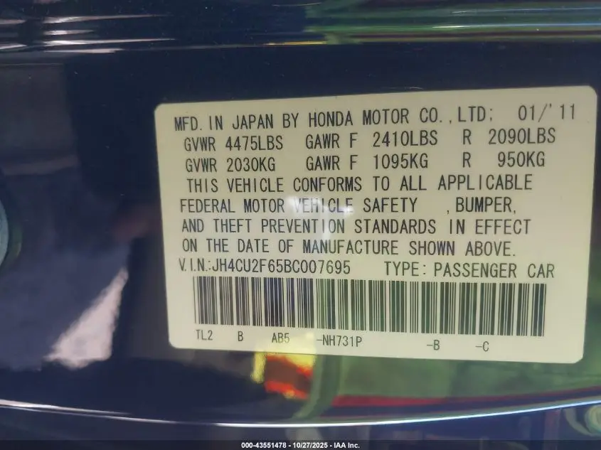 ACURA TSX 2011 2.4 Black 2.4L I-4 DOHC, VVT, 201HP VIN: JH4CU2F65BC007695