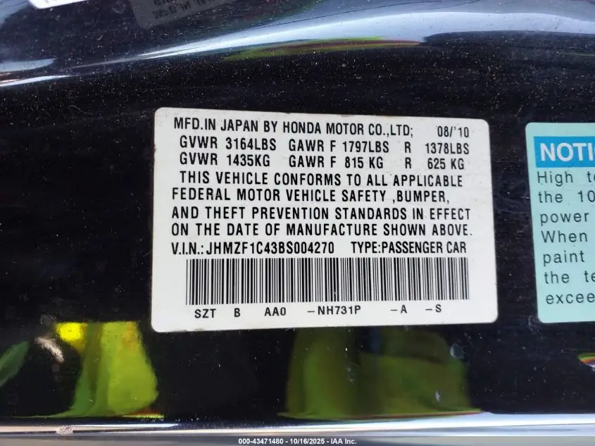 JHMZF1C43BS004270 VIN decoding