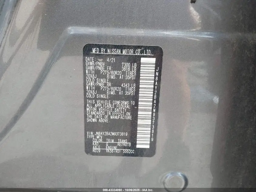 NISSAN ARMADA 2021 SL 2WD Gray 5.6L V-8 DI, DOHC, VVT, 400HP VIN: JN8AY2BA2M9373819