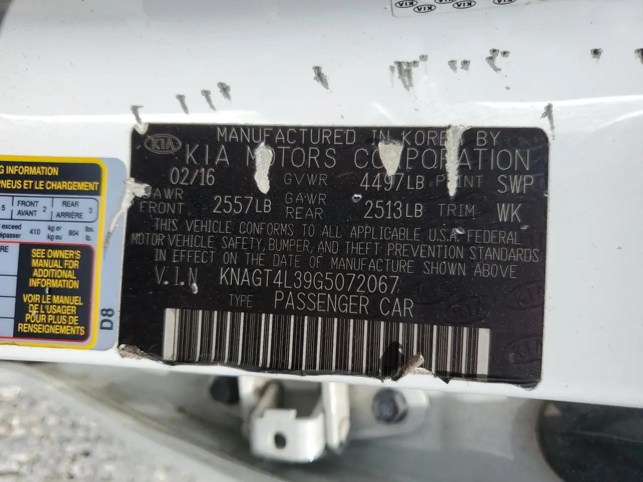 KIA OPTIMA 2016 LX WHITE 2.4L 4 VIN: KNAGT4L39G5072067