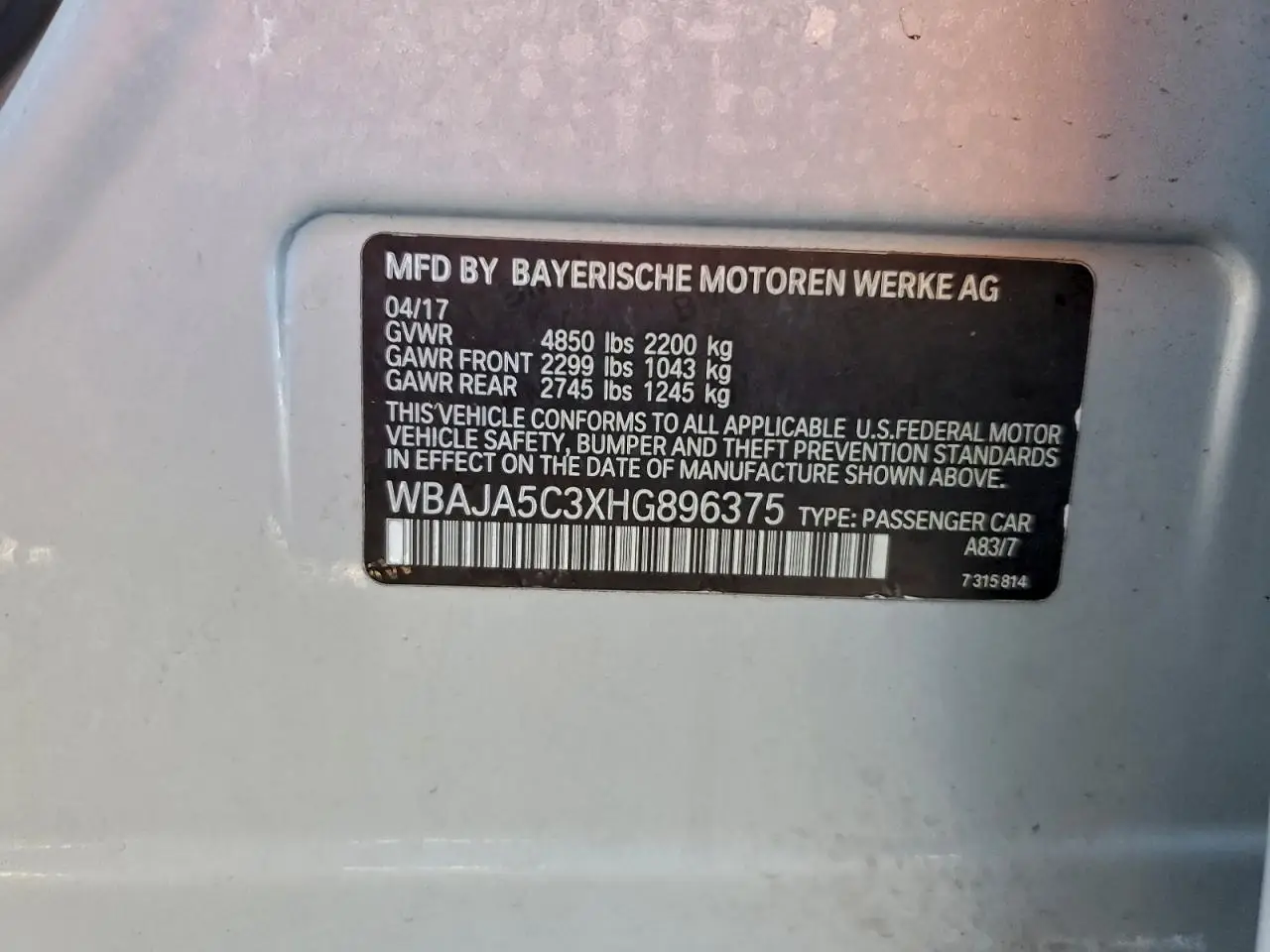 BMW 5 SERIES 2017 530 I SILVER 2.0L 4 VIN: WBAJA5C3XHG896375