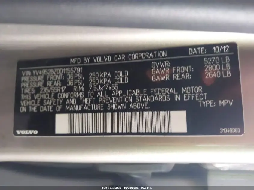 VOLVO XC70 2013 3.2/3.2 PLATINUM/3.2 PREMIER/3.2 PREMIER PLUS Champagne 3.2L I-6 DOHC, VVT, 240HP VIN: YV4952BZ0D1155791