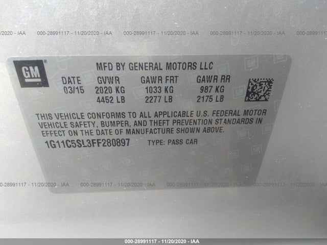 CHEVROLET MALIBU 2015 LT (1LT) ECOTEC 2.5L DOHC 4-cylinder VIN: 1G11C5SL3FF280897