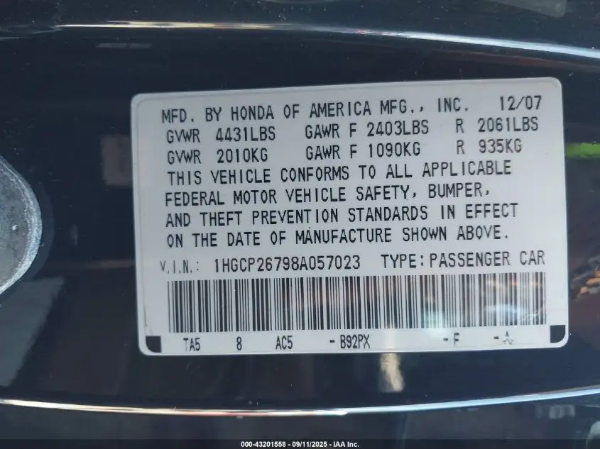 HONDA ACCORD 2008 2.4 EX Black 2.4L I-4 DOHC, VVT, 190HP VIN: 1HGCP26798A057023