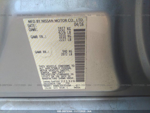 NISSAN ALTIMA 2016 2.5L DOHC 16-Valve 4-Cylinder VIN: 1N4AL3AP5GC221326