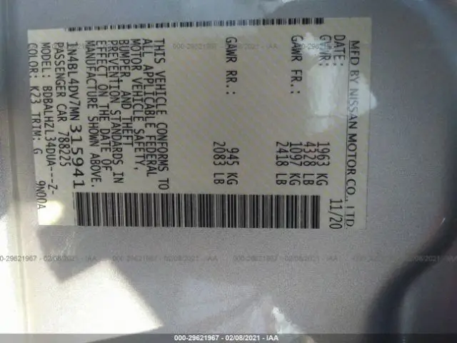 NISSAN ALTIMA 2021 GRADE SV 2.5L DOHC 16-Valve 4-Cylinder VIN: 1N4BL4DV7MN315941