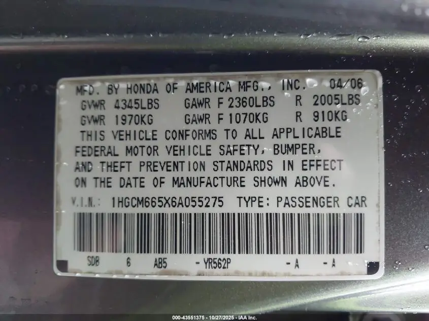 1HGCM665X6A055275 Decodificación del VIN