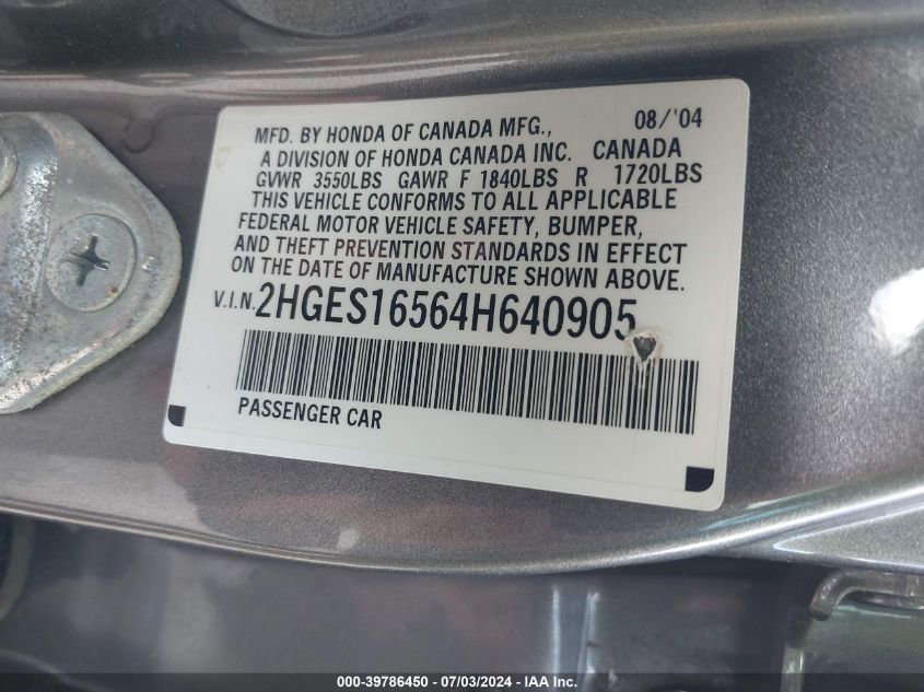 HONDA CIVIC 2004 LX Gray 1.7L I-4 115HP VIN: 2HGES16564H640905