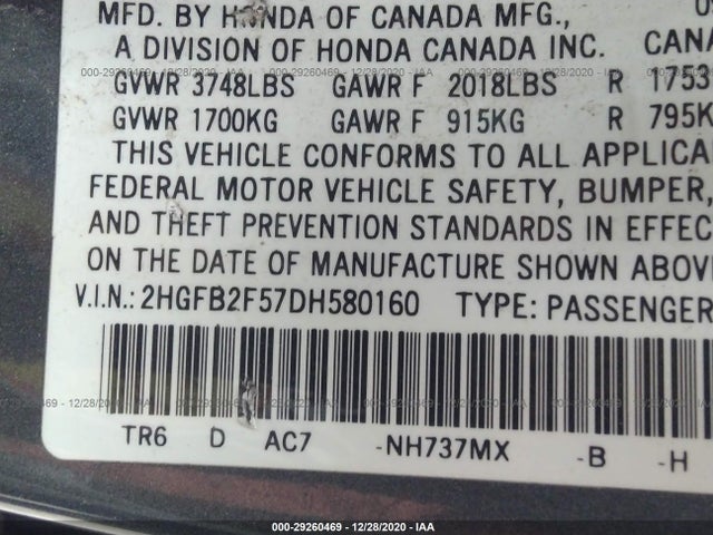 HONDA CIVIC SDN 2013 LX 1.8L SOHC MPFI 16-valve VIN: 2HGFB2F57DH580160