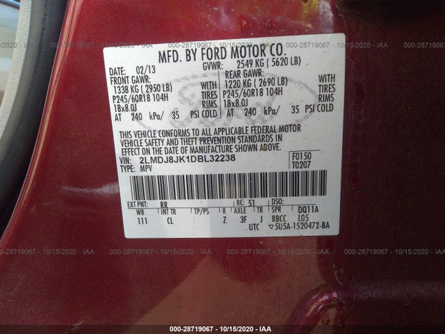 LINCOLN MKX 2013 3.7L Ti-VCT V6 engine VIN: 2LMDJ8JK1DBL32238