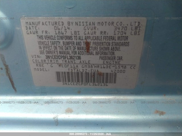 NISSAN VERSA NOTE 2015 1.6L DOHC 16-Valve 4-Cylinder VIN: 3N1CE2CP0FL362136