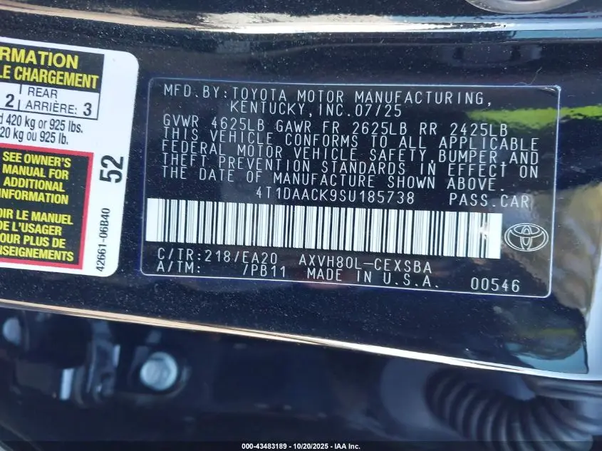 TOYOTA CAMRY 2025 SE 2.5L I-4 DI, DOHC, VVT, 184HP VIN: 4T1DAACK9SU185738