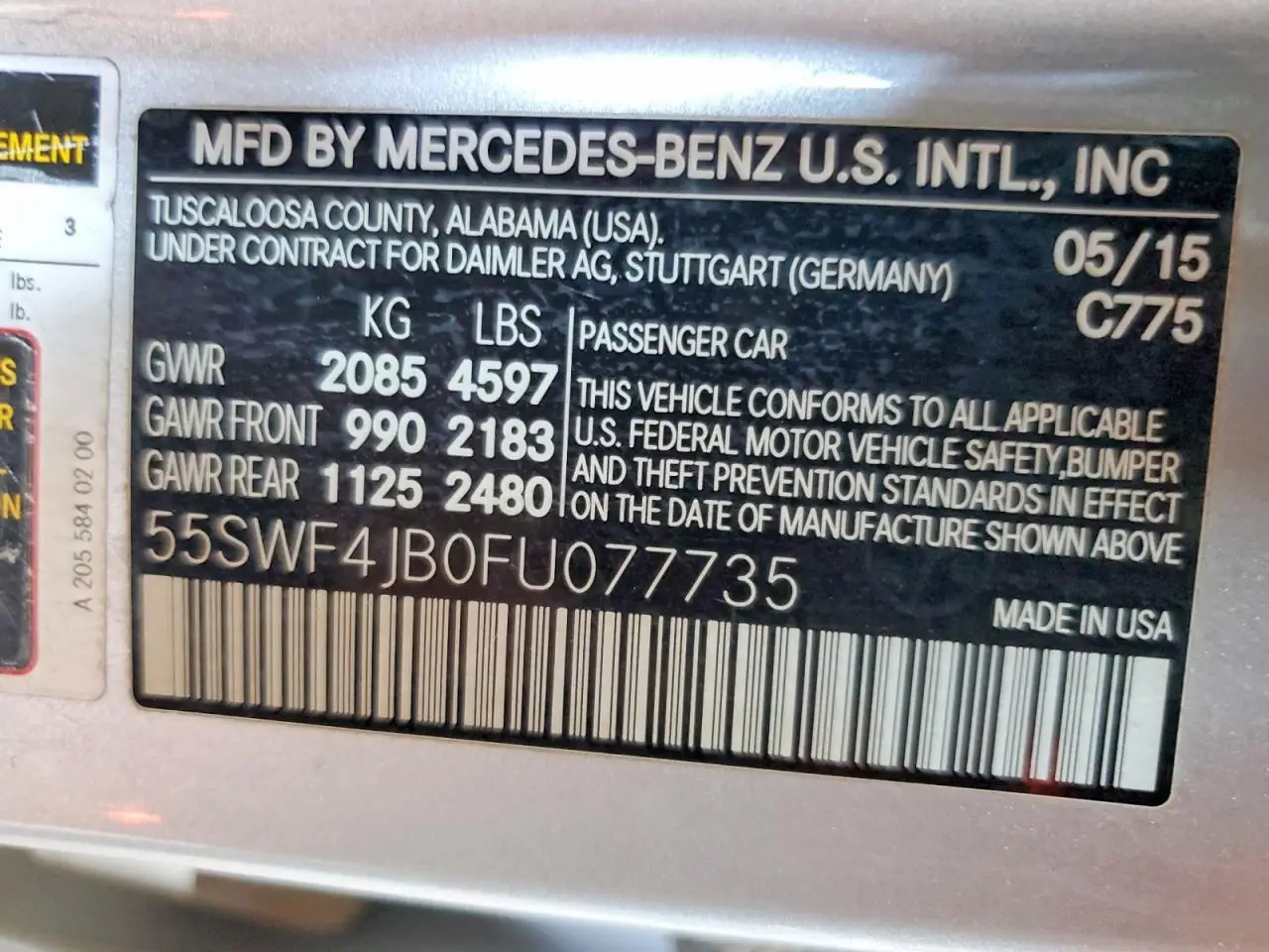 MERCEDES-BENZ C-CLASS 2015 C SILVER 2.0L 4 VIN: 55SWF4JB0FU077735